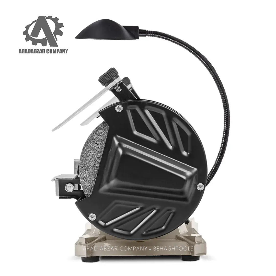 • اقلام همراه: معمولاً شامل دو سنگ (یک سنگ زبر برای براده‌برداری و یک سنگ نرم‌تر برای تیزکاری/پرداخت)، محافظ جرقه (spark‑protector)، پایه نگهدارنده قطعه (work‑piece support) است.